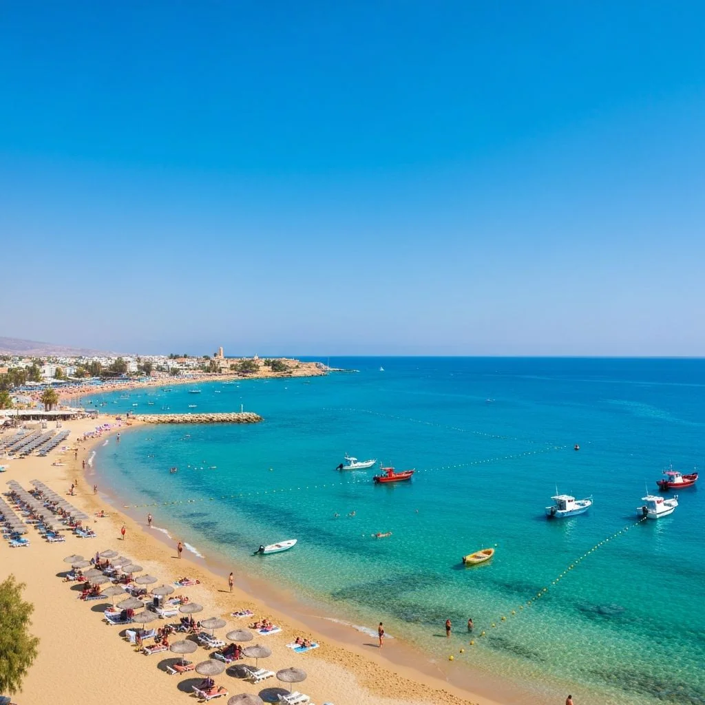 The nearest resort beach, with soft golden sand and shallow turquoise water. Full facilities, water sports, and beach bars — the most popular stretch on the Paphos coast.
